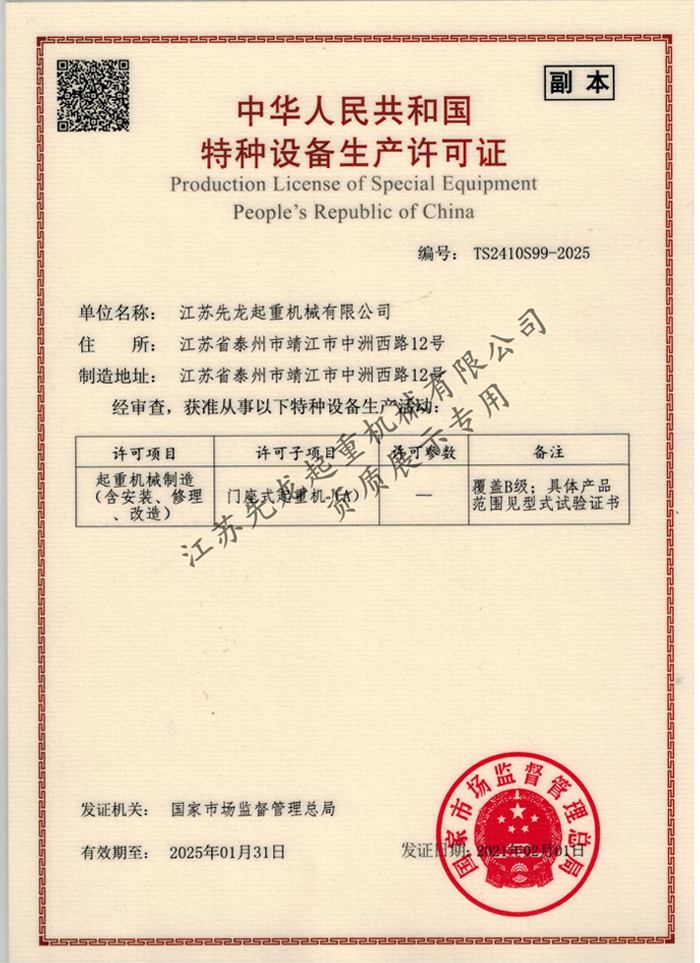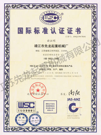 江蘇先龍起重機(jī)械有限公司(原靖江市先龍起重機(jī)械廠)是改制后的獨(dú)資企業(yè),本廠是生產(chǎn)起重運(yùn)輸機(jī)械的專業(yè)化企業(yè),并先后通過了ISO9001:2000質(zhì)量管理體系認(rèn)證、獲得國家頒發(fā)的HGQ50T固定式起重機(jī)和DLQ20T輪胎式起重機(jī)的特種設(shè)備制造許可證、特種設(shè)備安裝維修改造許可證。